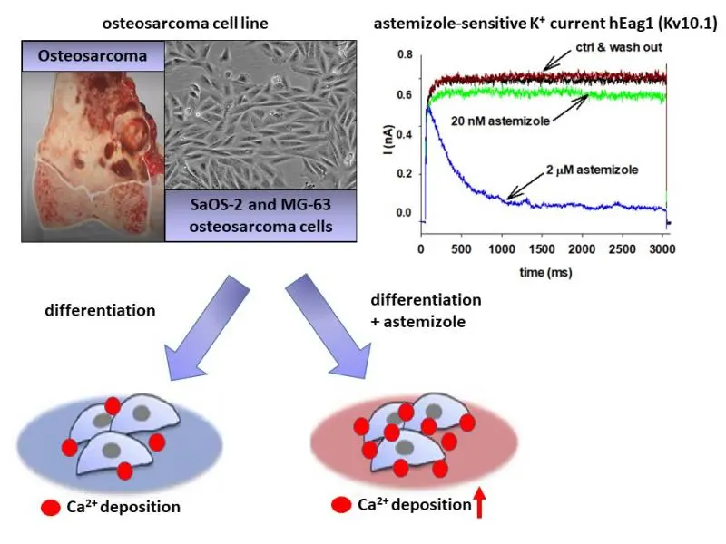Osteosarcoma is the sixth most common cancer in children and adolescents; therefore, the development of novel treatment strategies is very important to cure the patients. The expression of voltage-gated hEag1 K+ channel (Kv10.1) was described in a wide range of cancer and tumor cells, and these can influence the osteogenesis in other cell types. Therefore, Prof. Gyorgy Panyi and his colleagues hypothesized that hEag1 may play a role in the osteogenic differentiation of osteosarcoma, so it would be a potential drug target in the treatment of disease. Using molecular biology (RT-PCR), electrophysiology (patch-clamp) and pharmacology (astemizole sensitivity, IC50=0.135 M) they demonstrated that SaOS-2 osteosarcoma cells also express hEag1 channels. Astemizole is an old antihistamine, which is able to inhibit the hEag1 channels as well. Astemizole (in 2µM) significantly increased/enhanced Ca2+ deposition (a marker of mineral matrix production) of SaOS-2 and MG-63 cell cultures when osteogenic differentiation was induced either by the classic or by the pathological pathway. hErg1(Kv11.1) is very sensitive ion channel for the astemizole, but they did not detect either the transcript or the hErg1 protein in SaOS-2 and MG-63 cells, and the electrophysiological measurement did not reveal the presence of hErg1-like current in SaOS-2 osteosarcoma cells either. They propose that the inhibition of hEag1 may be a useful tool to drive terminal differentiation of osteosarcoma by repurposing a well-known antihistamine drug, astemizole. Their results were published in the International Journal of Molecular Sciences (DOI: https://doi.org/10.3390/ijms231810533)