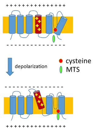 Figure: The location of the gate can be found by using MTS reagents that irreversibly bind to cysteine residues introduced into the channel sequence at specific locations. Binding of the MTS inhibits the current through the channel. The accessibility of the cysteine to MTS in the open or closed state of the channel gives information about location of that residue position.