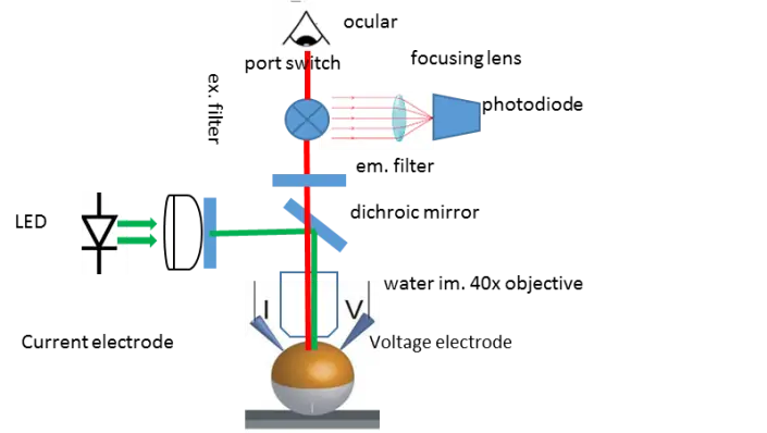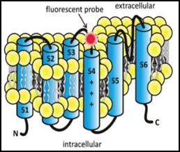 Figure: In Voltage-clamp Fluorometry frog oocytes are injected with the RNA of the channel to be studied. A cysteine residue is inserted in the sequence to label it with a fluorescent dye. The membrane potential of the cell is controlled by two electrodes and the current through the channels is measured. The rearrangement of the voltage-sensor is followed by the change in the fluorescence of the dye. This allows independent observation of the pore (current) and the voltage-sensor (fluorescence).