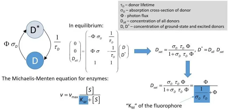 - We have shown that intensity-based FRET experiments carried out at high excitation intensities, commonly achieved in confocal microscopy, lead to severely underestimated FRET values if the analysis is carried out with the conventional equations disregarding fluorophore saturation. Fluorophore saturation is a situation when most fluorophores are in the excited state. The effect of this phenomenon on donor quenching is summarized in the figure below: